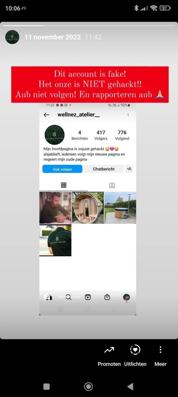 Ja, eens je het ontdekt is het even verschieten natuurlijk. Op de foto kan je een nepaccount zien van onze klant Wellnez Atelier. Je ziet dat ze al 417 volgers verzameld hebben.